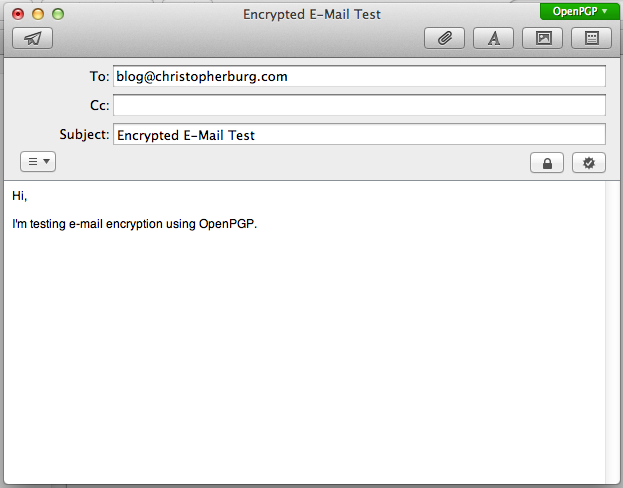 Now you are ready to communicate over e-mail securely. Let's send an encrypted e-mail to blog [at] christopherburg [dot] com. Open up the Mail application and start a new e-mail. When composing your e-mail you will notice two buttons sitting below the subject field on the right-hand side: