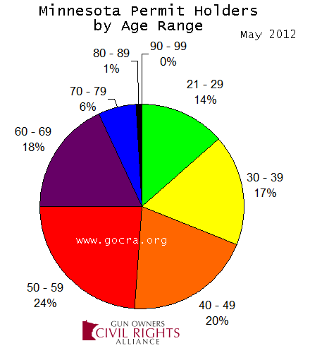 Andrew Rothman, Vice President of the Minnesota Gun Owners Civil Rights Alliance (MNGOCRA) was good enough to e-mail me a few days ago to alert me that Minnesota would soon be exceeding 100,000 carry permit holders. Along with this notification Andrew also sent me the breakdown of permit holder statistics by age range: